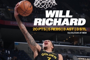 勇士官方晒出理查德海报,理查德成为自2012年4月16日的克莱·汤普森之后,首位打出这一数据的勇士新秀?。