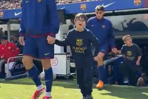 体育资讯3月22日讯 西甲第29轮比赛,巴萨在诺坎普迎战巴列卡诺。本场比赛之前,巴萨球员手牵唐氏综合症球童走进球场,表达了对他们的关爱。