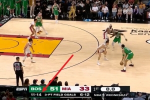 第一节,凯尔特人外线箭如雨下,单节全队三分15投11中,命中率高达73.3%,单节净胜热火20分。