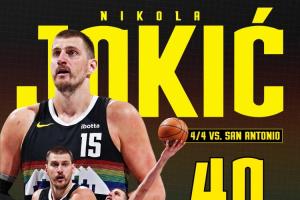 近7场5次砍下大三双?约基奇轰40分8板13助0失误创中锋历史纪录