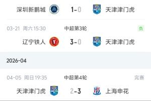 体育资讯04月05日讯 中超第4轮,天津津门虎主场2-3被上海申花逆转,虽然球队取得了赛季进球0的突破,但是仍1平3负积-9分中超垫底。