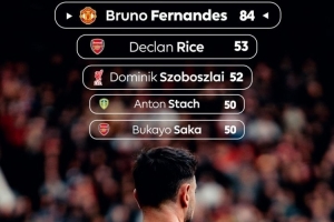 体育资讯3月2日讯 英超官方晒本赛季联赛球员创造机会次数榜,B费84次遥遥领先,第二赖斯53次。