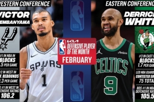 体育资讯3月4日讯 今日NBA官方宣布,马刺球星文班亚马和凯尔特人球员德里克·怀特分别被评为西部和东部二月份最佳防守球员。